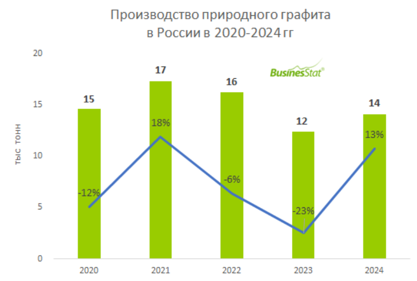 Согласно исследованию BusinesStat «Анализ рынка природного графита в России», в 2024 году выпуск природного графита в стране продемонстрировал уверенный рост на 13%, достигнув показателя в 14 тысяч тонн. Данный рост обусловлен увеличением потребления графита в ключевых секторах промышленности, включая металлургию, машиностроение, электротехнику, энергетику, химическую, автомобильную и атомную отрасли.